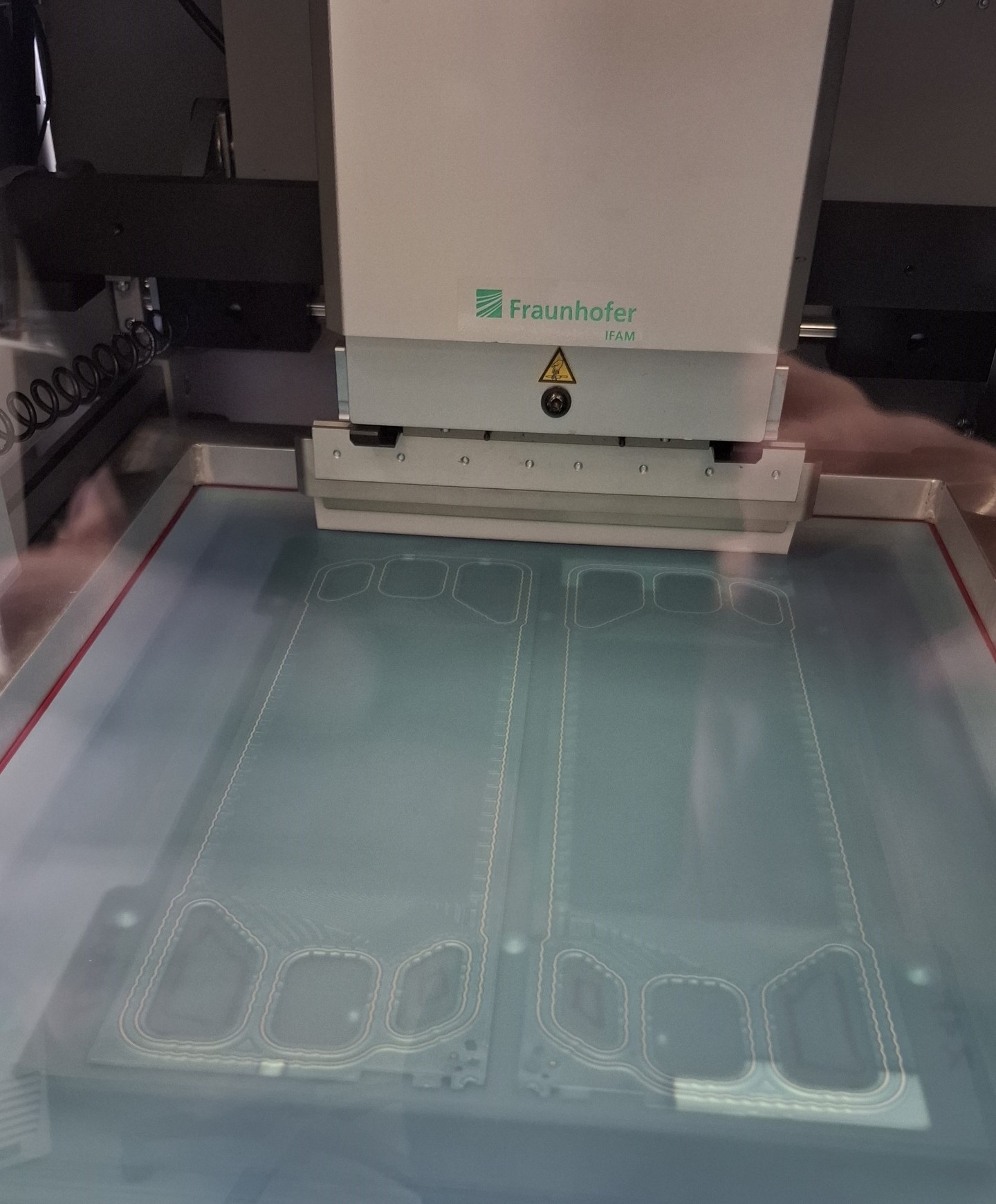 Der Siebdruckprozess stellt eine innovative Methode zur hochpräzisen Applikation von Klebstoffen auf Bipolarplatten dar und wird am Fraunhofer IFAM intensiv erforscht. Durch den Einsatz eines feinmaschigen Siebes, welches mit einer der Sickengeometrie angepassten Sperrschicht versehen ist, können die Klebstoffe in exakt definierten Mustern und Mengen auf die geprägte Dichtsicke der Bipolarplatte auftragen werden. Dies ermöglicht eine präzise und kontrollierte Applikation, die für die hochratenfähige vollautomatisierte Produktion von Brennstoffzellen innerhalb kürzester Taktzeiten optimal geeignet ist.